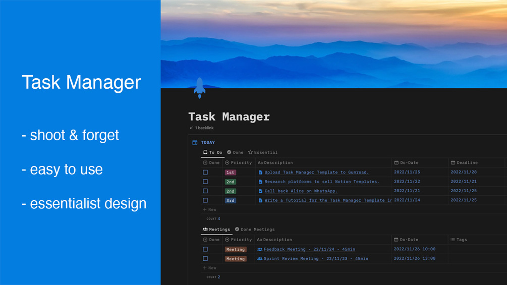 This Notion Task Manager is an essentialist design, “shoot & forget” system.